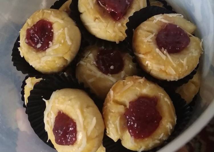 - Setelah dingin, beri selai strawberry di atas satu potong nastar, kemudian tutup dengan potongan nastar yang lainnya.